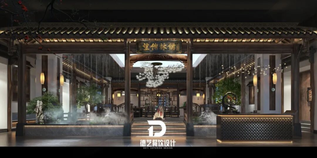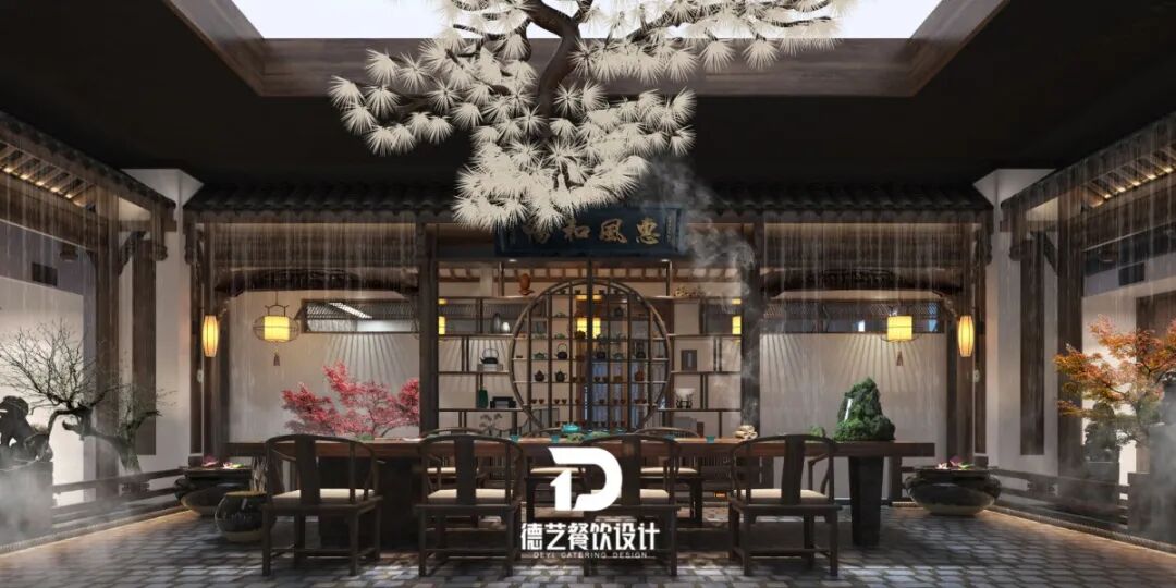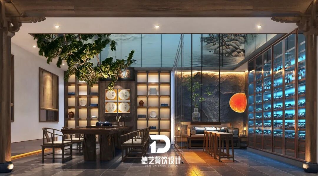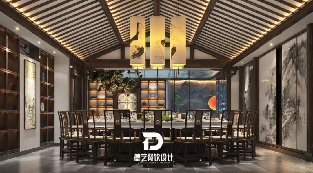 风致雅健的木制品、肆意挥洒的水墨画,以及瓷器、绿植等点缀其中,再用以细腻丰富的设计手法,德艺餐饮设计完美地将这些融入于场景中,使整个空间雅致而富有诗意。