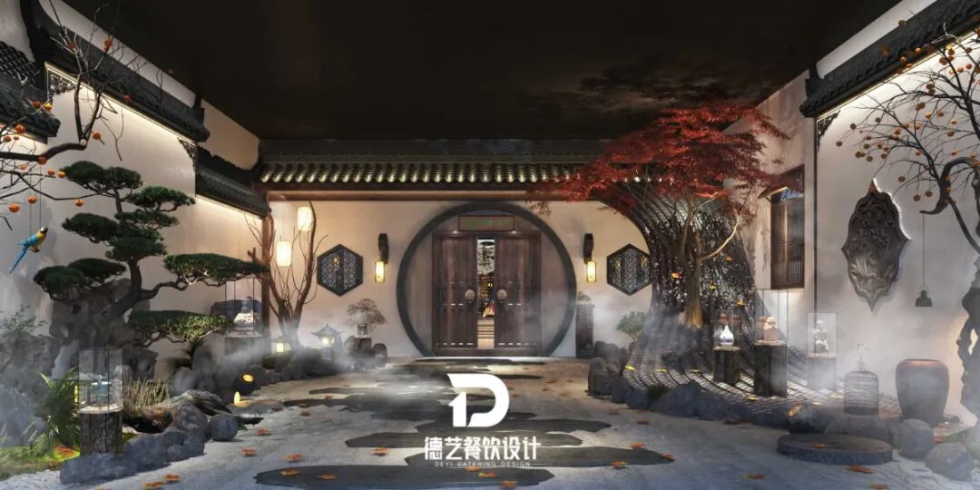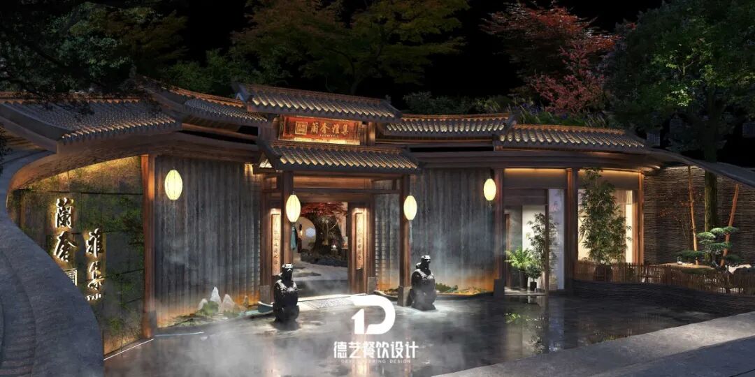 瓦片在门头上的广泛运用,使屋面过渡之处平滑而连续,让建筑本身更显挺拔与庄严。石狮坐立于入门之处,沉稳大气,中式仿古牌匾,复古雅致,入户庭院的设计,让入口与包厢之间起着过渡作用,承载着德艺餐饮设计的别出心裁。