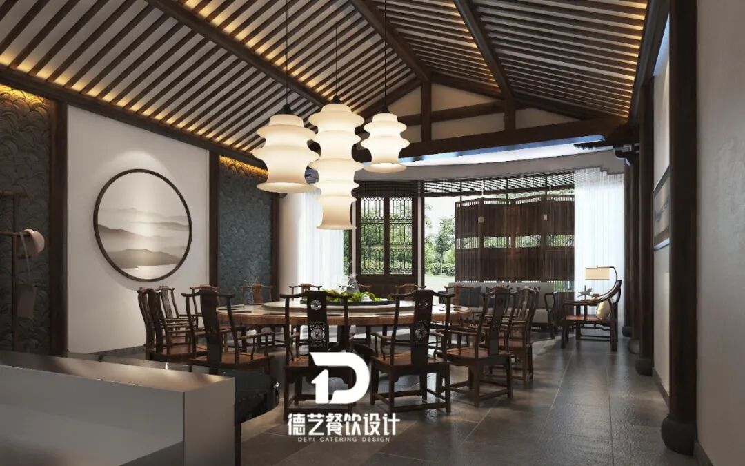 04/色彩 木材作为新中式风格中的代表材料之一,在色彩表现方面运用十分广泛。深浅各异的原木色与自然纹理,以及黑白灰的融入,使整个空间更充满层次与诗意。 05/灯光 灯光设计采用虚实结合手法,天花采用灯带设计渲染氛围,中心位置吊灯不规则形状与水墨色彩外观的运用与组合。德艺餐饮设计利用灯光控制好虚实关系,让空间充满更多层次与变化。